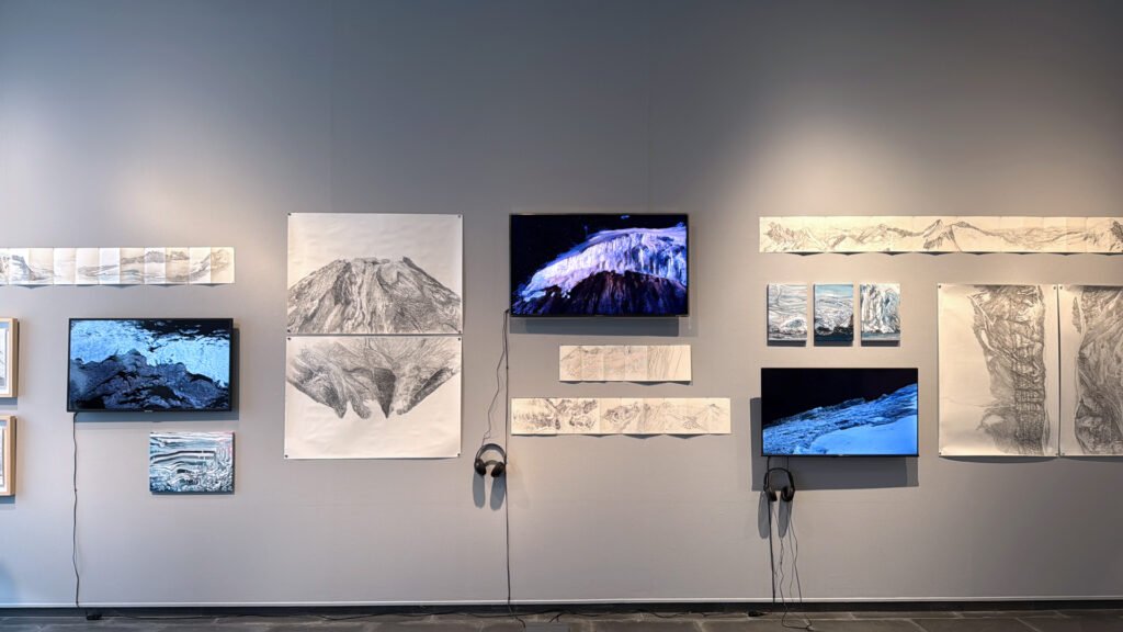 That is why the exhibition is made up of a hybrid body of works combining videos, notebooks, sketches, drawings, cartographies, and paintings of various glaciers: Dulima, Poleka-Kasue, and Kumanday in her native Colombia, using their ancestral names; Aneto and Cadí-Moixeró in Huesca and Catalonia, respectively. Also included are works from Mont Blanc and from her recent stay in Antarctica. All these materials are exhibited equally, without visibility or reading hierarchies. This is a deliberate gesture to highlight the overlap of different representational forms, emphasizing the richness of her practice, the myriad of approaches, and the impossibility of grasping, fixing, or capturing the enormity, depth, and latent energy of her subject of interest.