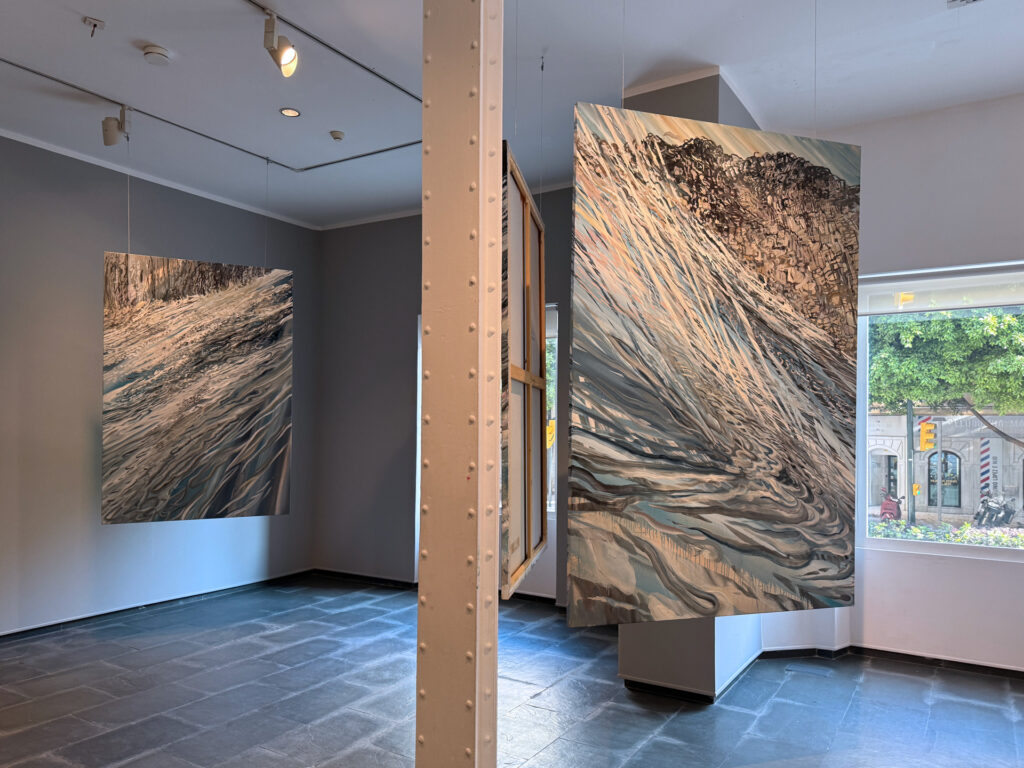 Her paintings, on the other hand, are visualization devices of the mountain—not through the spectacular image of the drone, but through a subjective interpretation forged in direct bodily relationship with the object of study, like a tactile record of mountain dynamics in dialogue with her personal experiences. A vibrant and luminous painting technique speaks of a fabulist and affective approach to the mountain—one that reflects the relationships between the material mountain and the metaphorical one.