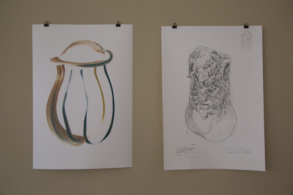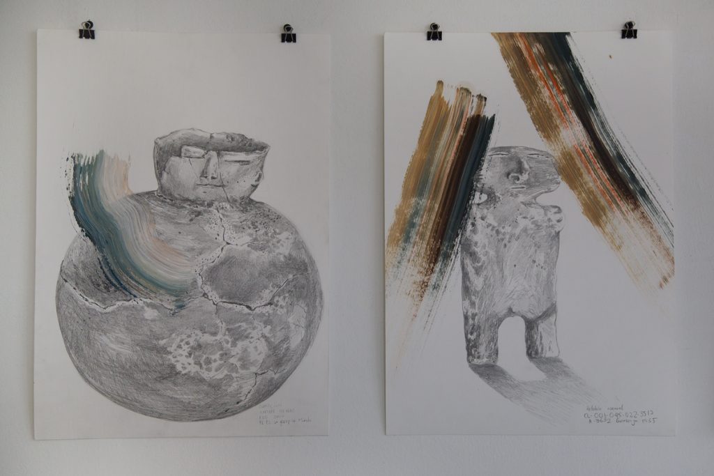 La intervención al interior del Museo, fue una puesta en escena de los dibujos realizados de piezas arqueológicas, junto con piezas de mi propia producción, apropiaciones cerámicas expuestas como macetas y algunas replicas. El objetivo era hacer un espacio entre laboratorio y taller, donde se acercasen las piezas al espectador como escenario para proyectar nuevas historias sobre ellas. Esta intervención también conto con un video documental, cuyo relato expongo mis inquietudes sobre nuestra relación con el pasado precolombino.