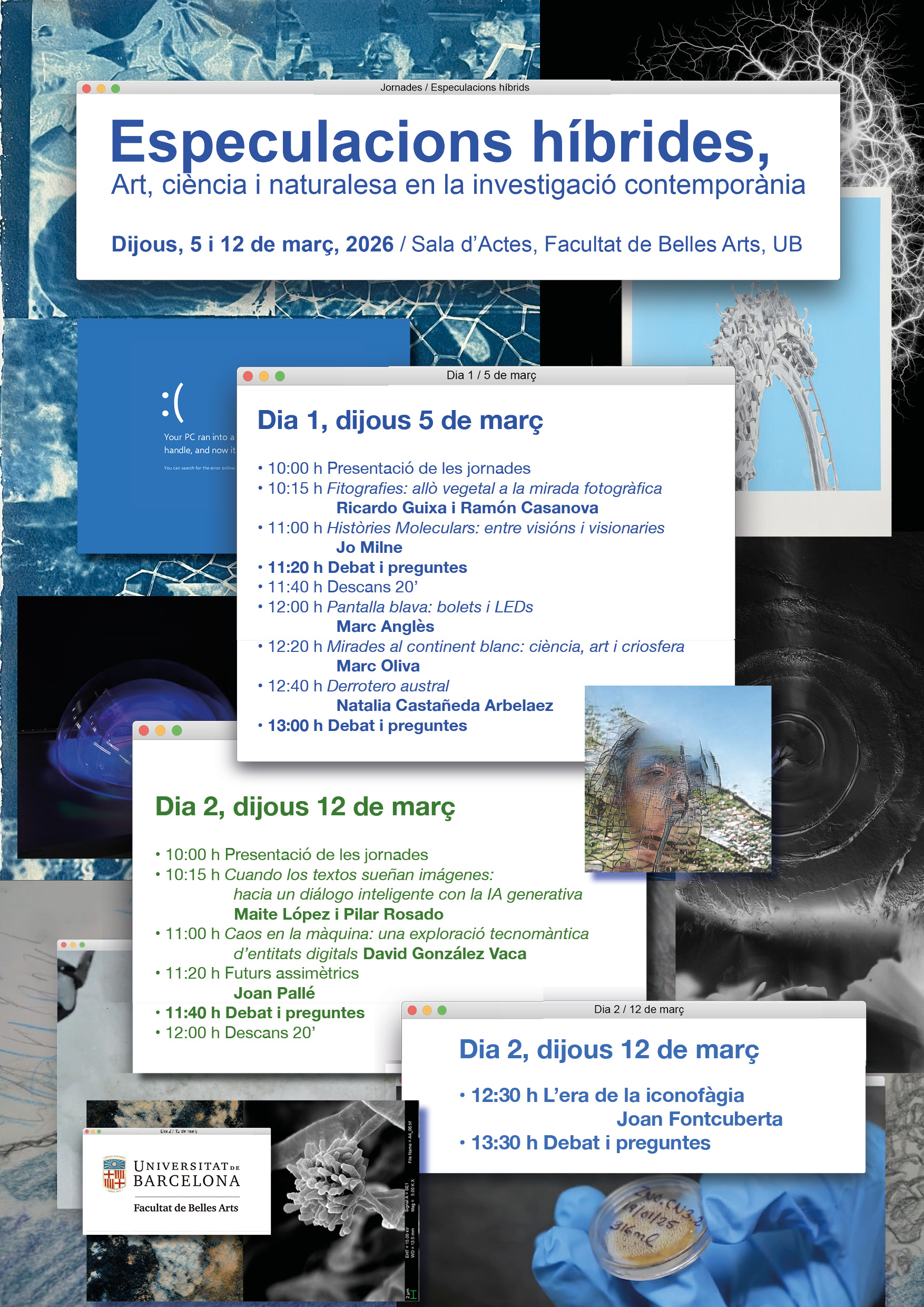 - Jornades ESPECULACIONS HÍBRIDES, Art, ciència i naturalesa en la investigació contemporànea. Facultat de Belles Arts, Universitat de Barcelona, 5 y 12 de març 2026.